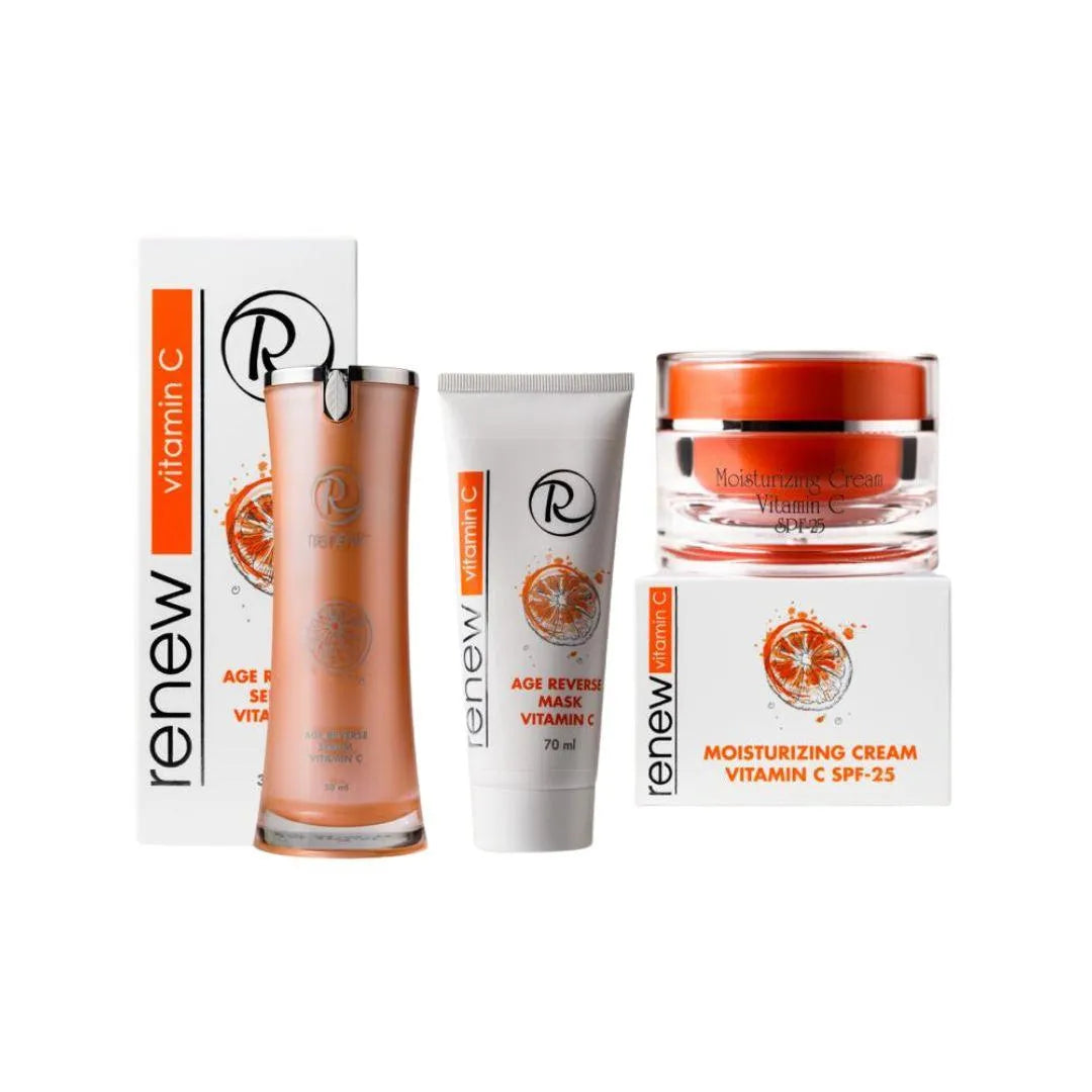מארז של חברת רניו מסדרת ויטמין C המכיל קרם לחות ויטמין SPF25 C, סרום ויטמין C ומסכת ויטמין C.